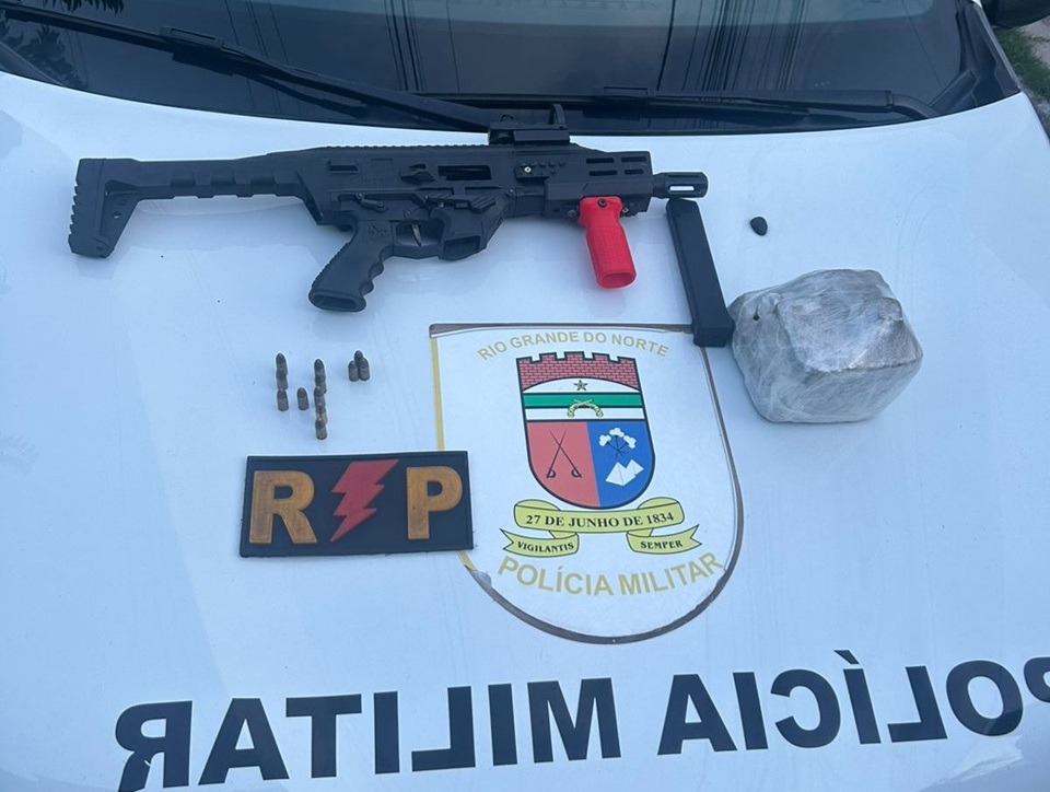 Um homem de 26 anos foi preso na tarde desta quarta-feira (4) após ser flagrado com uma submetralhadora de fabricação artesanal, produzida por meio de impressão 3D, além de munições e entorpecentes, no loteamento Brasil Novo, bairro Pajuçara, na Zona Norte de Natal.