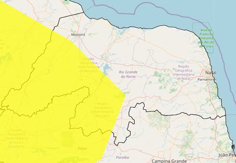 O alerta vale até às 23h59 da segunda-feira (29) e afeta cidades como Mossoró, Pau dos Ferros, Caicó, Currais Novos, Apodi e Assu.