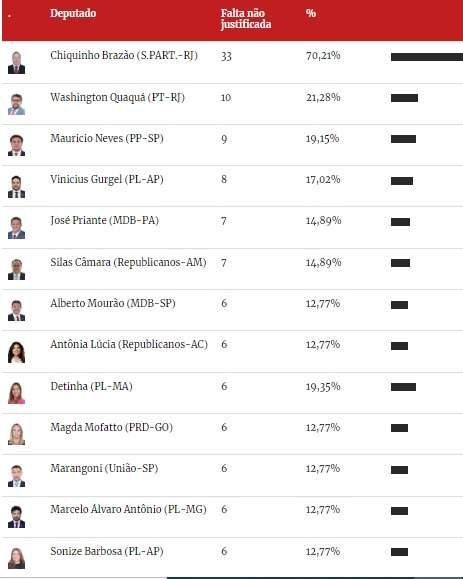 Veja a lista dos primeiros colocados no ranking de faltas não justificadas: