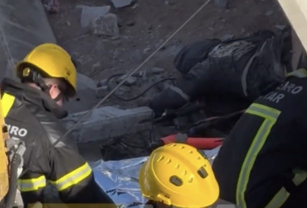 Os bombeiros confirmaram que um dos trabalhadores foi resgatado com vida e transportado para atendimento médico.