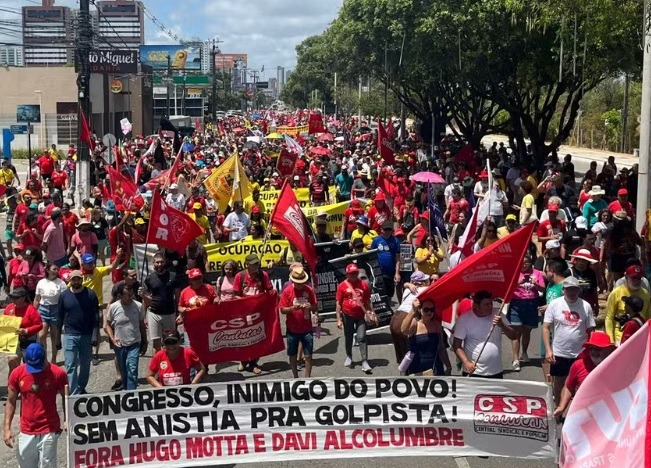 Manifestantes de esquerda realizaram um protesto neste domingo (14) em Natal contra o Projeto de Lei da Dosimetria (PL 2162/23). A manifestação teve início no bairro de Capim Macio e seguiu no sentido Ponta Negra, atrapalhando o trânsito na Avenida Engenheiro Roberto Freire. Com informações de g1-RN.