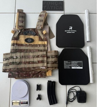 Entre os itens apreendidos estão um conjunto de mira para armas de uso primário, uma capa de colete balístico e duas placas de cerâmica da marca Raptor Tactical, utilizadas em coletes à prova de balas.