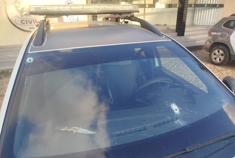 Uma viatura da Polícia Militar foi atingida por pelo menos dois disparos durante um confronto entre militares e criminosos na madrugada desta quarta-feira (5) na Zona Leste de Natal.