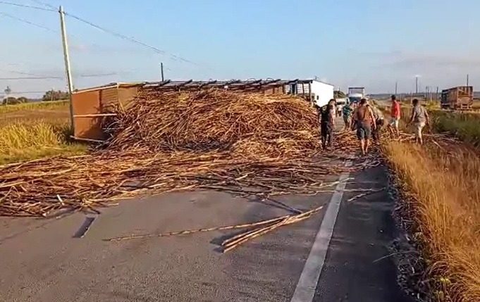 Imagens mostram a carreta tombada ocupando toda a extensão da faixa, dificultando a passagem de veículos e provocando lentidão no tráfego local.