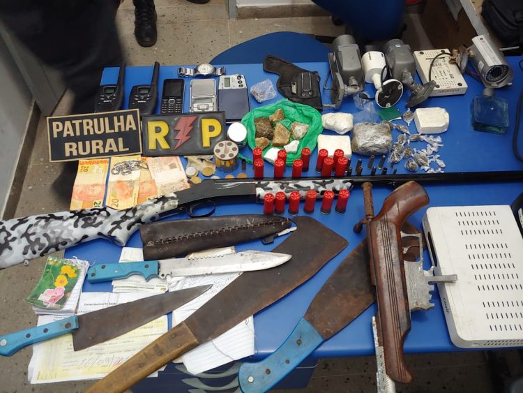 Contudo, a equipe do patrulhamento rural conseguiu apreender vasto material da quadrilha, como armas, drogas e material eletrônico de vídeo monitoramento. Todo material apreendido foi conduzido para a Delegacia Regional da cidade de Pipa, onde foi feito o procedimento.